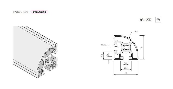 Profilo in Alluminio 45x45 C.10 Raggiato Piano PR045045RP