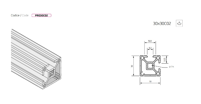 Il Profilato in Alluminio 30x30 Cava 8 2C è un componente costruttivo in alluminio anodizzato di qualità, parte della serie modulare C.8; in questa configurazione presenta due cave chiuse a 90° e due aperte.
